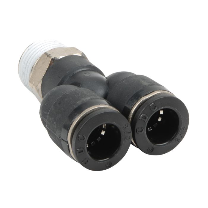 NITRA pneumatic push-to-connect fitting, male, Y, rotating, thermoplastic (PBT) body, nickel-plated brass threads, (2) 3/8in tube to 3/8in NPT connection(s). Package of 5.