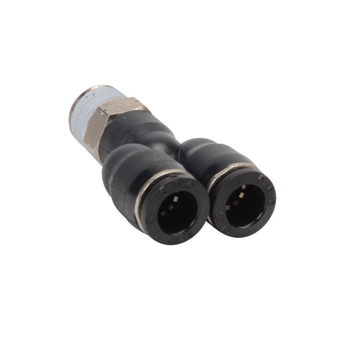 NITRA pneumatic push-to-connect fitting, male, Y, rotating, thermoplastic (PBT) body, nickel-plated brass threads, (2) 5/16in (8mm) tube to 1/4in NPT connection(s). Package of 5.