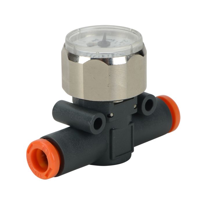 NITRA pneumatic push-to-connect inline pressure gauge, technopolymer body, 1/4in tube inlet(s), 1/4in tube outlet(s), 0-170 psi range.