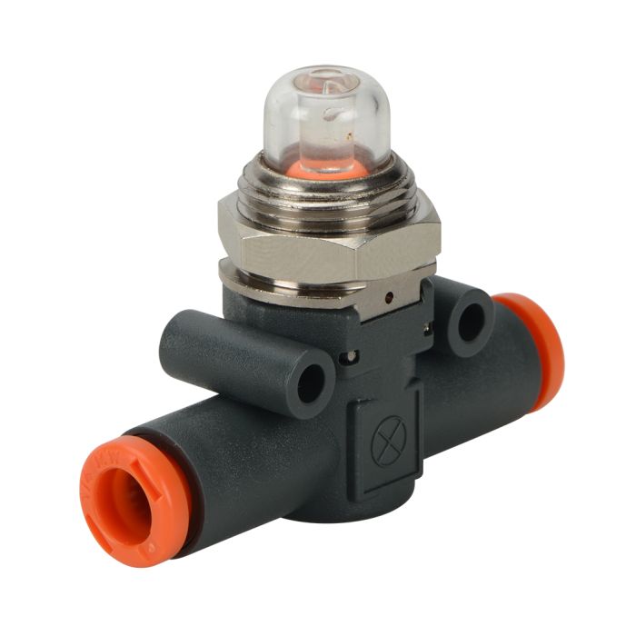 NITRA pneumatic push-to-connect inline pressure indicator, technopolymer body, 1/4in tube inlet(s), 1/4in tube outlet(s), 29-145 psi range, orange indication.