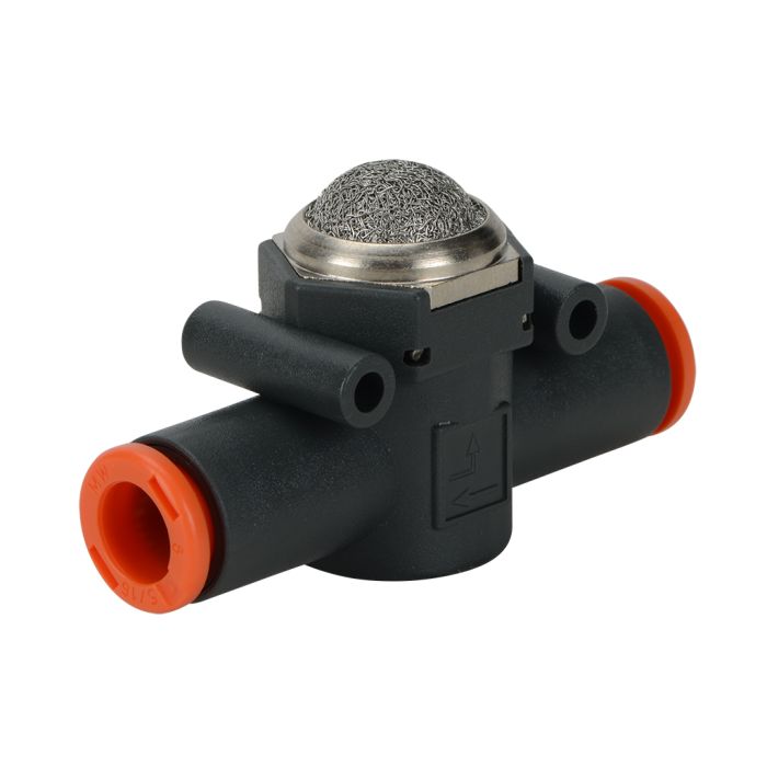 NITRA pneumatic push-to-connect inline quick exhaust valve, technopolymer body, 5/16in (8mm) tube inlet(s), 5/16in (8mm) tube outlet(s), silenced exhaust(s).