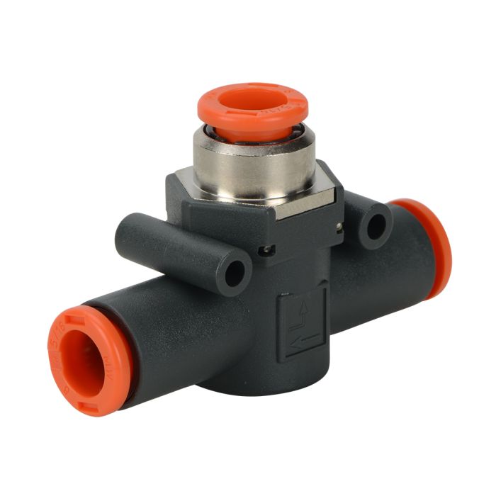 NITRA pneumatic push-to-connect inline quick exhaust valve, technopolymer body, 5/16in (8mm) tube inlet(s), 5/16in (8mm) tube outlet(s), 5/16in (8mm) tube exhaust(s).