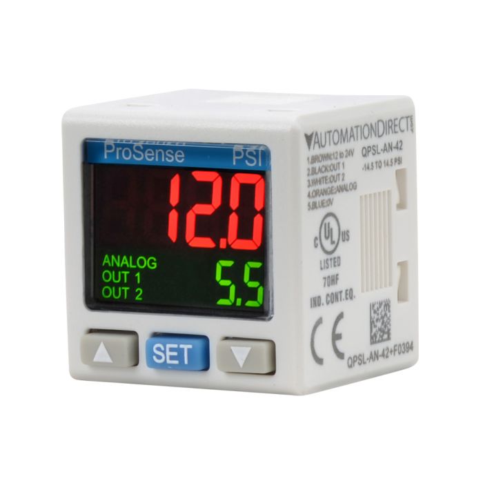 ProSense digital pneumatic pressure switch / transmitter, -14.5 to 14.5 psi range, 2 NPN outputs, 4-20 mA output, 1/8 inch NPT, 12-24 VDC, 2-meter cable.