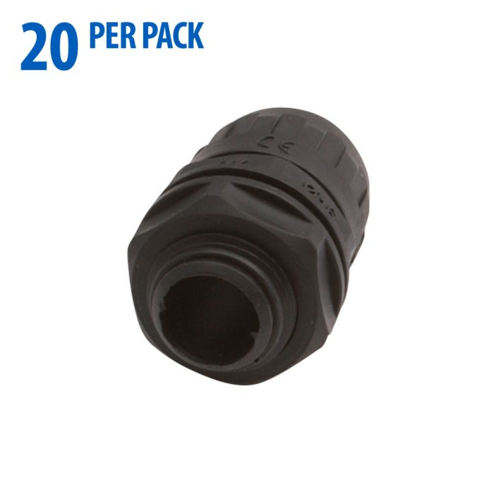 IBOCO connector, liquid-tight, for flexible tubing, straight, non-metallic, black, 1/2 inch. Seal gaskets included. Package of 20.