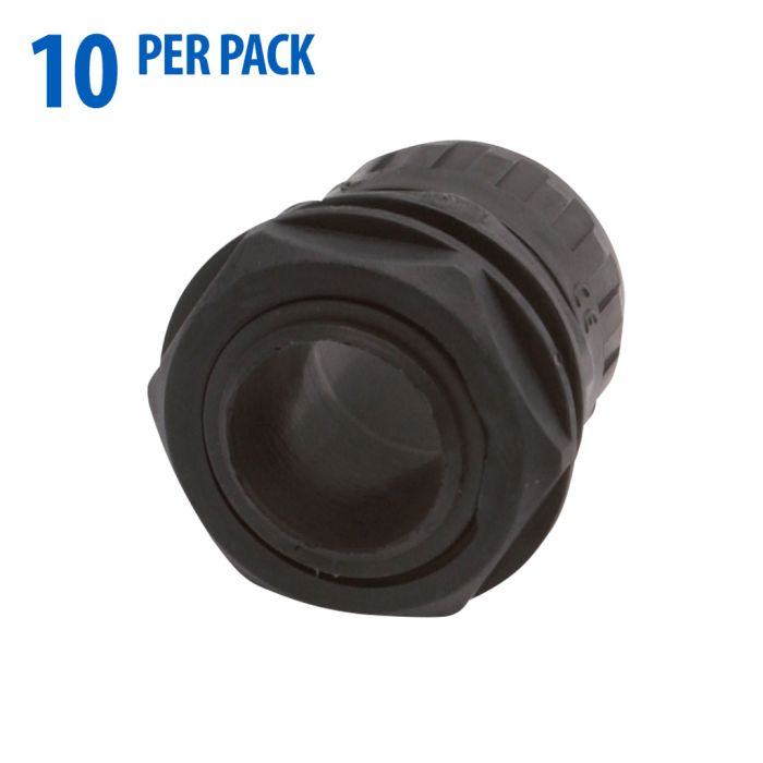 IBOCO connector, liquid-tight, for flexible tubing, straight, non-metallic, black, 1 inch. Seal gaskets included. Package of 10.
