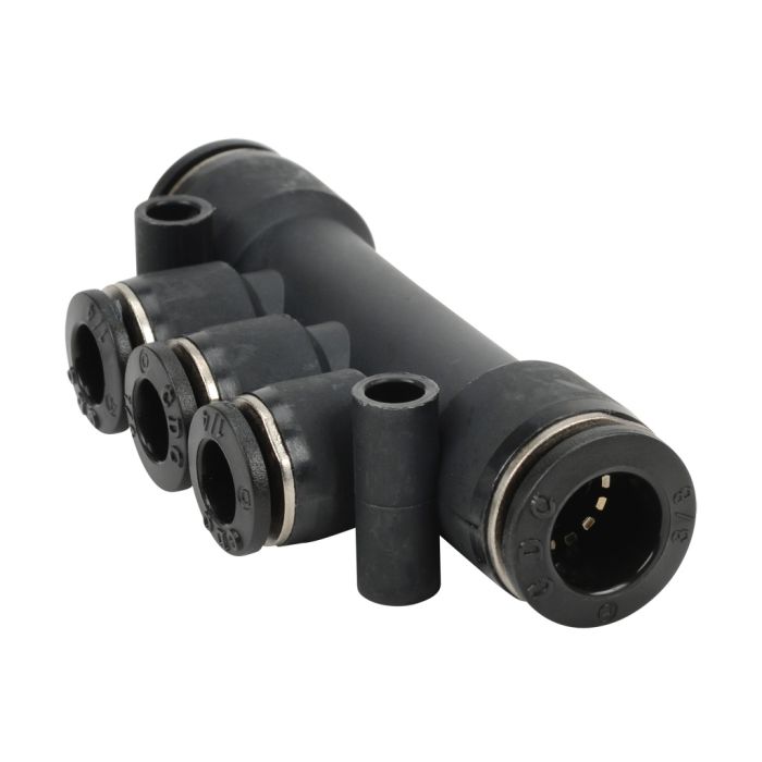 NITRA pneumatic push-to-connect fitting, union triple branch, thermoplastic (PBT) body, (2) 3/8in tube to (3) 1/4in tube connection(s). Package of 5.