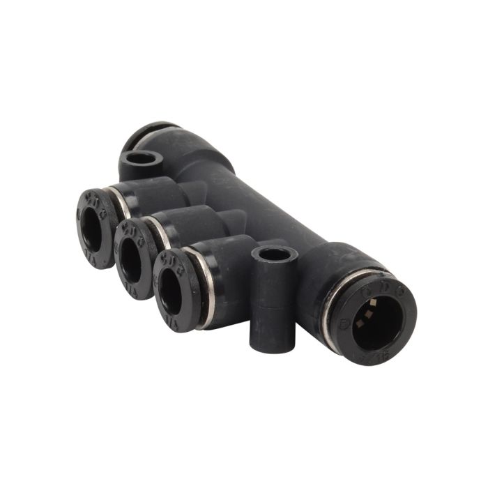 NITRA pneumatic push-to-connect fitting, union triple branch, thermoplastic (PBT) body, (2) 5/16in (8mm) tube to (3) 1/4in tube connection(s). Package of 5.