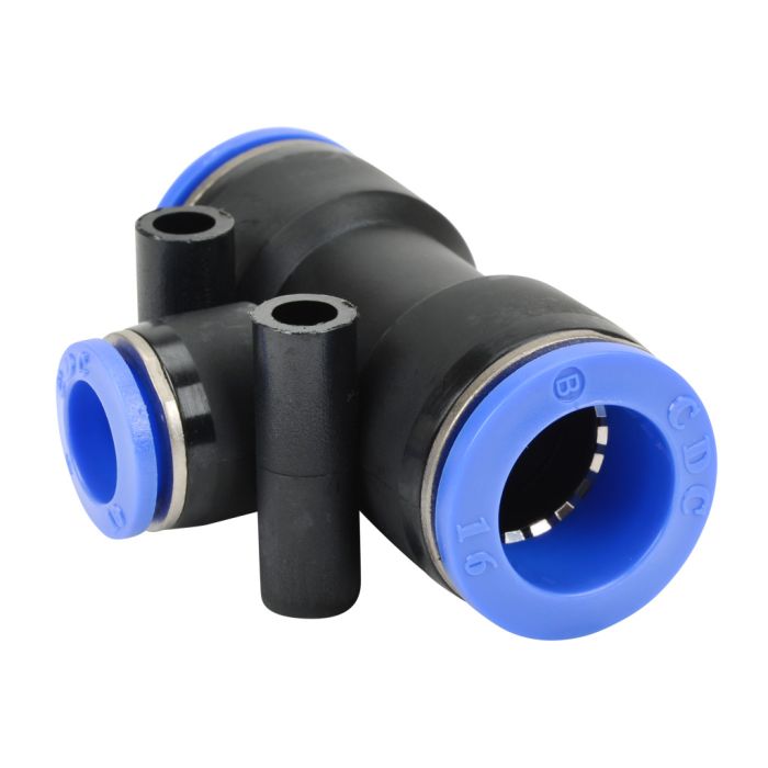 NITRA pneumatic push-to-connect fitting, union tee reducer, thermoplastic (PBT) body, (2) 16mm tube to 10mm tube connection(s). Package of 3.