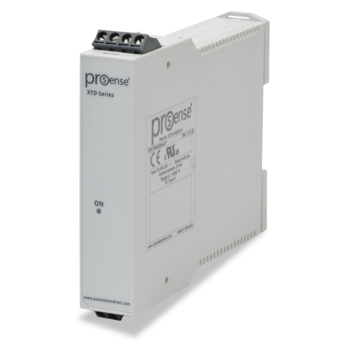 ProSense temperature transmitter, Type K thermocouple input, 4-20 mA output, 0 to 1000 deg. F fixed range, 12 to 35 VDC loop powered, 35mm DIN rail mounting.