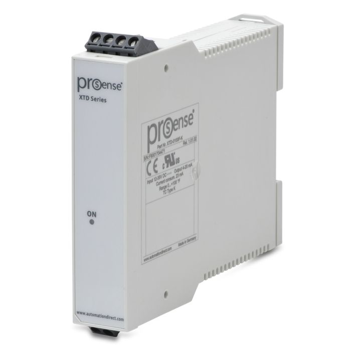 ProSense temperature transmitter, Type K thermocouple input, 4-20 mA output, 0 to 100 deg. F fixed range, 12 to 35 VDC loop powered, 35mm DIN rail mounting.