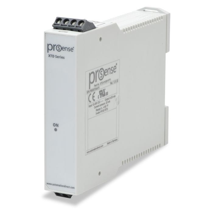 ProSense temperature transmitter, 3-wire Pt100 RTD input, 4-20 mA output, 0 to 100 deg. F fixed range, 12 to 35 VDC loop powered, 35mm DIN rail mounting.