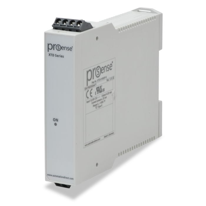 ProSense temperature transmitter, Type K thermocouple input, 4-20 mA output, 0 to 1500 deg. F fixed range, 12 to 35 VDC loop powered, 35mm DIN rail mounting.