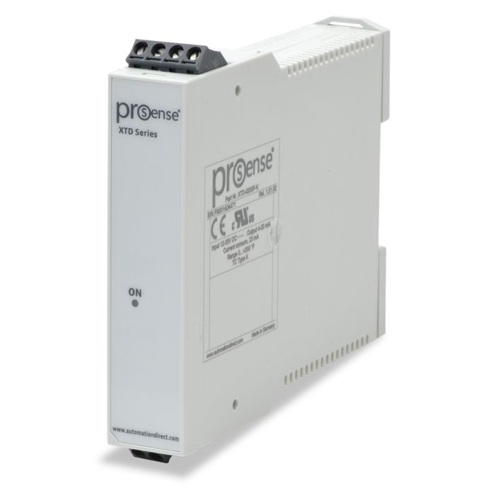 ProSense temperature transmitter, Type K thermocouple input, 4-20 mA output, 0 to 200 deg. F fixed range, 12 to 35 VDC loop powered, 35mm DIN rail mounting.
