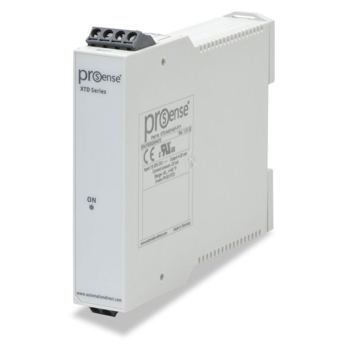 ProSense temperature transmitter, 3-wire Pt100 RTD input, 4-20 mA output, -40 to 140 deg. F fixed range, 12 to 35 VDC loop powered, 35mm DIN rail mounting.