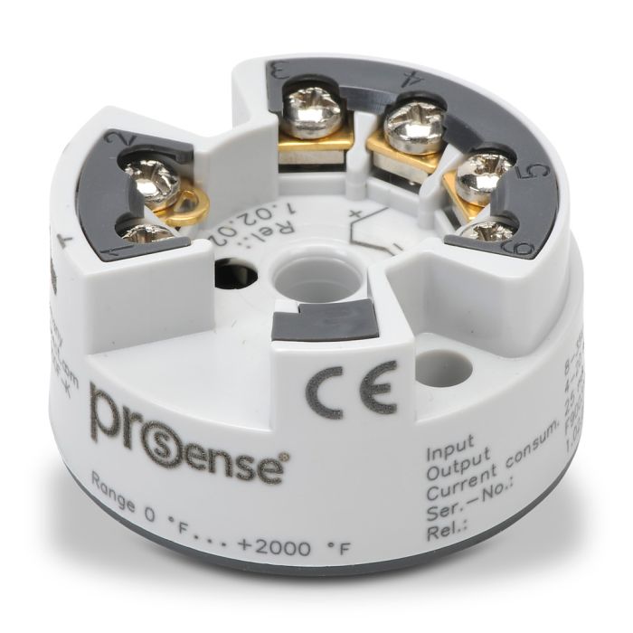 ProSense temperature transmitter, Type K thermocouple input, 4-20 mA output, 0 to 2000 deg. F fixed range, 8 to 35 VDC loop powered, connection head mount.