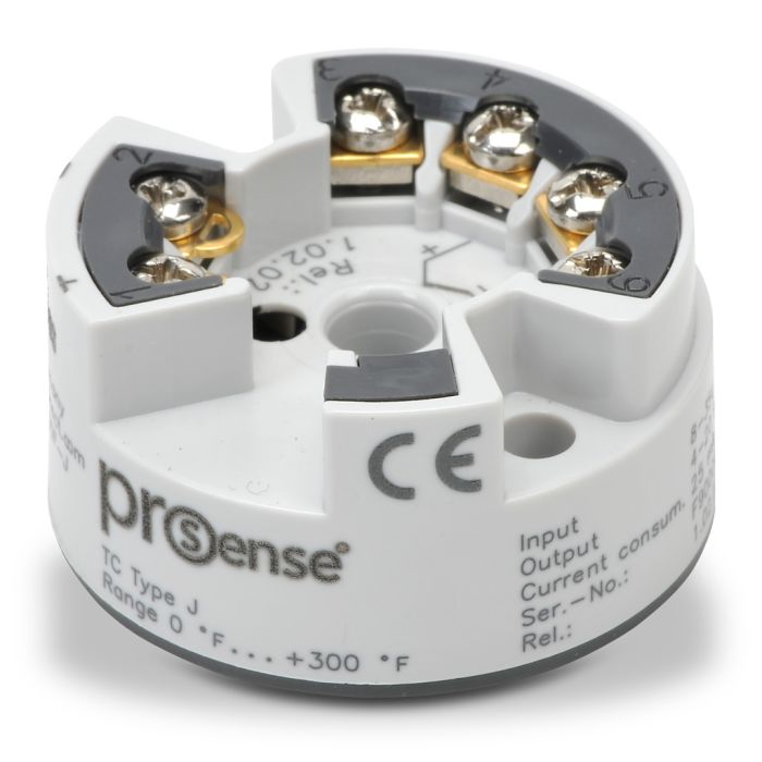 ProSense temperature transmitter, Type J thermocouple input, 4-20 mA output, 0 to 300 deg. F fixed range, 8 to 35 VDC loop powered, connection head mount.