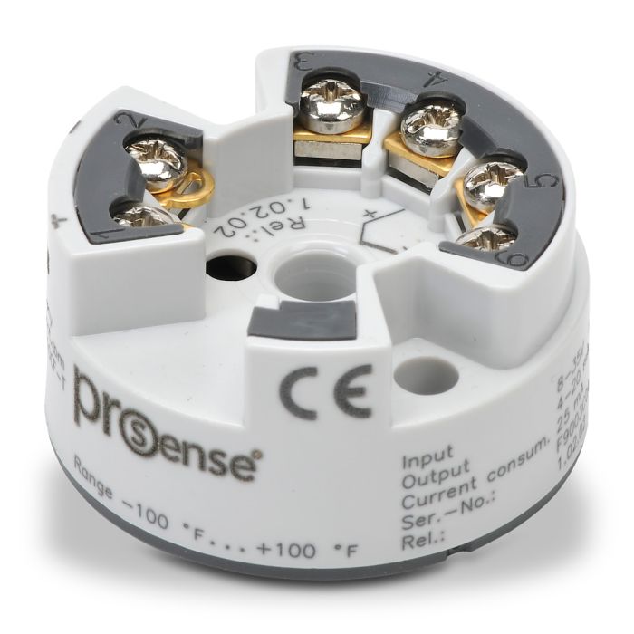 ProSense temperature transmitter, Type T thermocouple input, 4-20 mA output, -100 to 100 deg. F fixed range, 8 to 35 VDC loop powered, connection head mount.