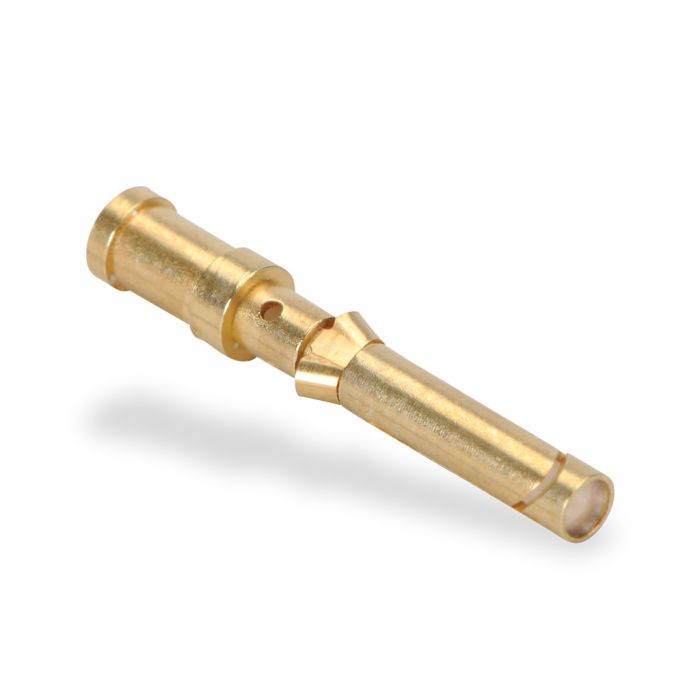 Machined crimp contact, female, 10 amp, 16AWG (1.5 mm sq.), gold-plated copper alloy. 100 contacts per package.
