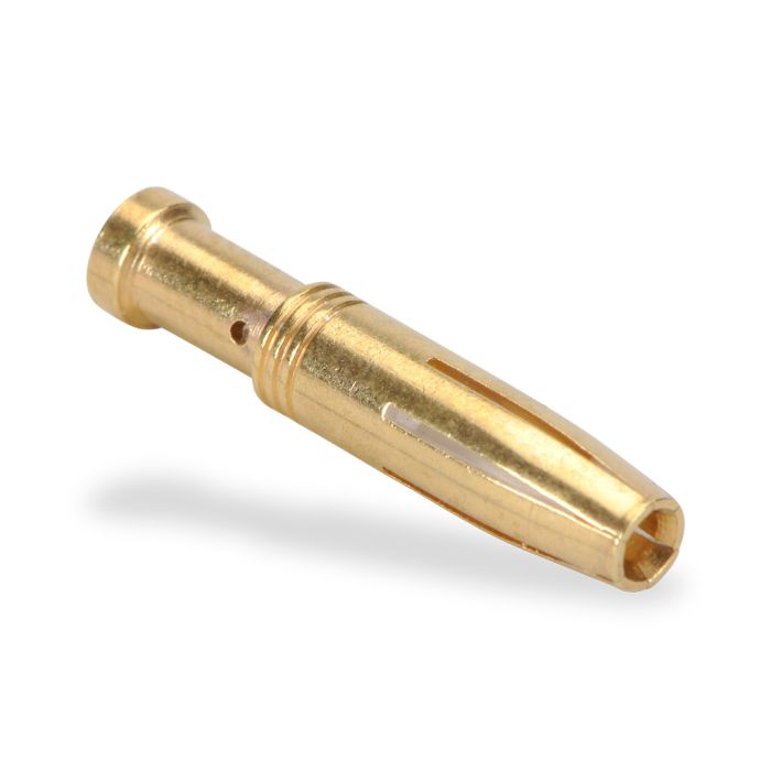 Machined crimp contact, female, 16 amp, 14AWG (2.5 mm sq.), gold-plated copper alloy. 100 contacts per package.