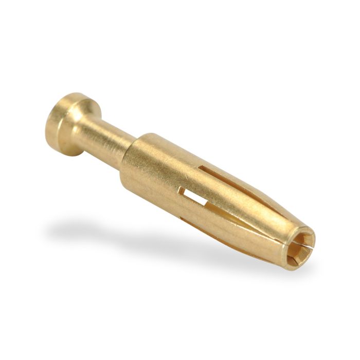 Machined crimp contact, female, 16 amp, 26 - 22 AWG (0.14 - 0.37 mm sq.), gold-plated copper alloy. 100 contacts per package.