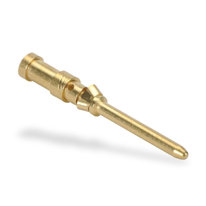 Machined crimp contact, male, 10 amp, 20AWG (0.5 mm sq.), gold-plated copper alloy. 100 contacts per package.