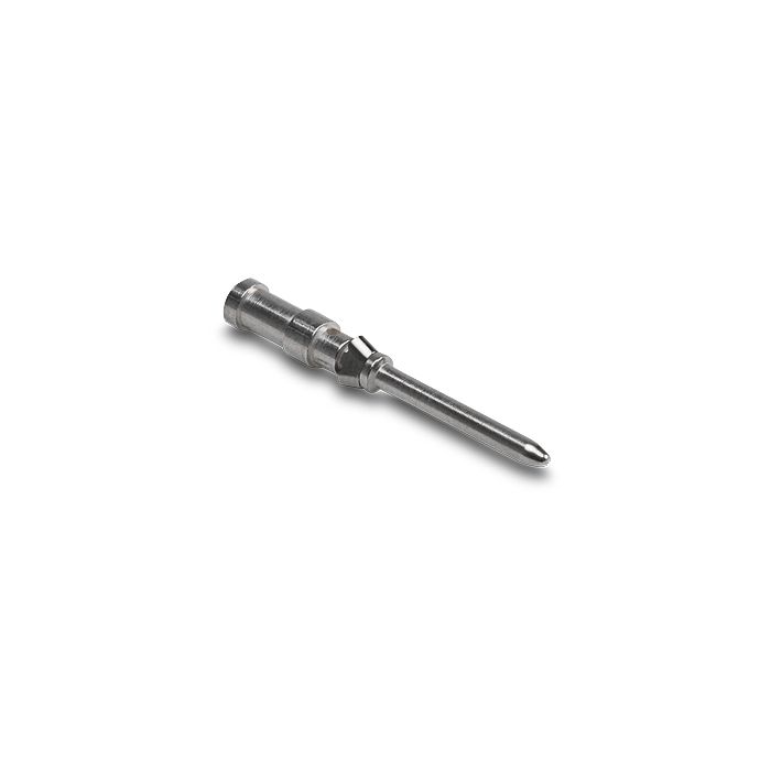 Machined crimp contact, male, 10 amp, 26-22 AWG (0.14 - 0.37 mm sq.), silver-plated copper alloy. 100 contacts per package.