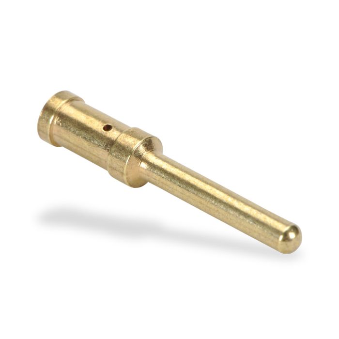 Machined crimp contact, male, 16 amp, 12AWG (4 mm sq.), gold-plated copper alloy. 100 contacts per package.