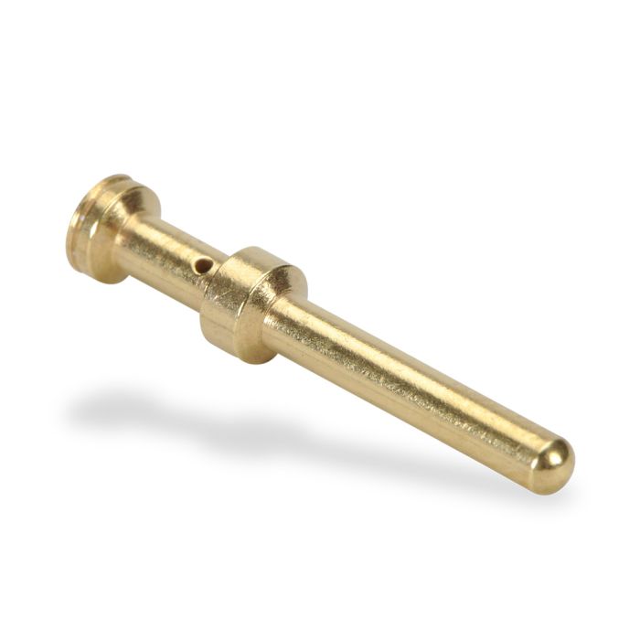 Machined crimp contact, male, 16 amp, 18AWG (0.75 mm sq.), gold-plated copper alloy. 100 contacts per package.