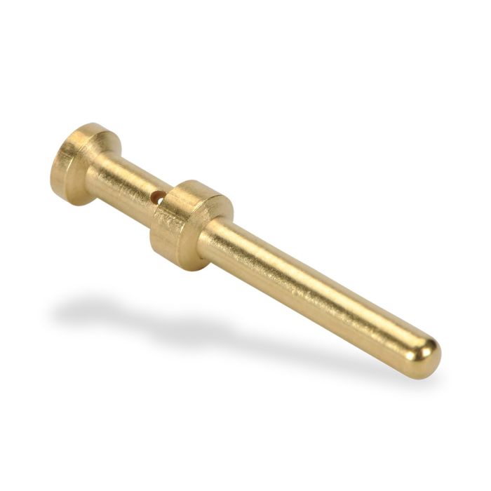 Machined crimp contact, male, 16 amp, 20AWG (0.5 mm sq.), gold-plated copper alloy. 100 contacts per package.