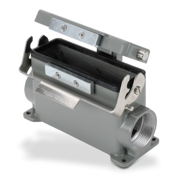 Base for ZIPport multi-wire industrial connector, size 24B, single lever, surface mount with automatic closing cover, (2) Pg 29 threaded holes, aluminum.