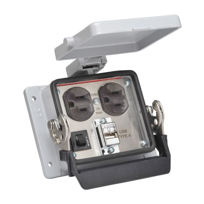 ZIPport panel connector : (1) duplex 120 VAC outlet, (1) USB form A female exterior / form A female interior, 3A breaker.