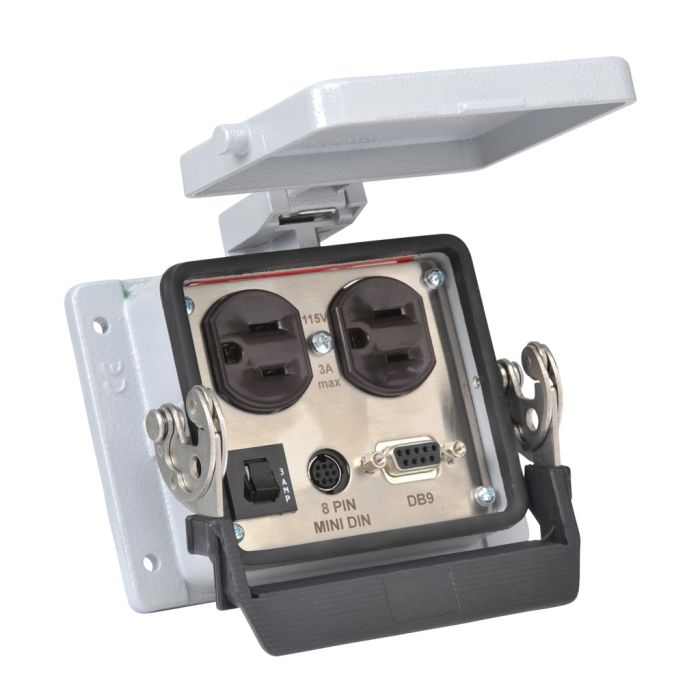 ZIPport panel connector: (1) duplex 120 VAC outlet, (1) 9-pin D-sub female/Data Highway , (1) 8-pin mini-DIN female/parallel Data Highway, 3A breaker.