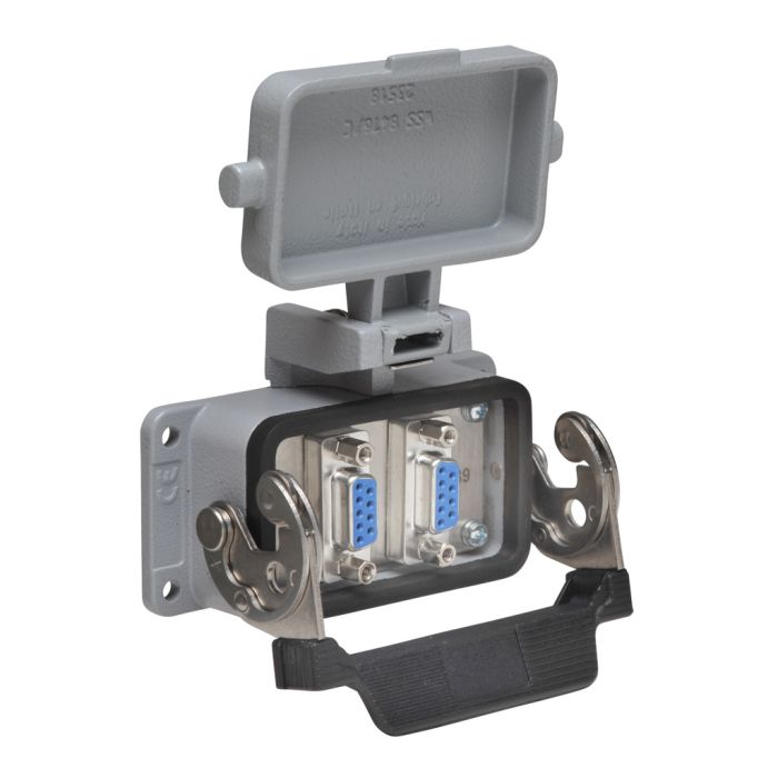 ZIPport panel interface connector with: (2) 9-pin D-sub connectors with female exterior / male interior; size 10 aluminum housing with gasket.