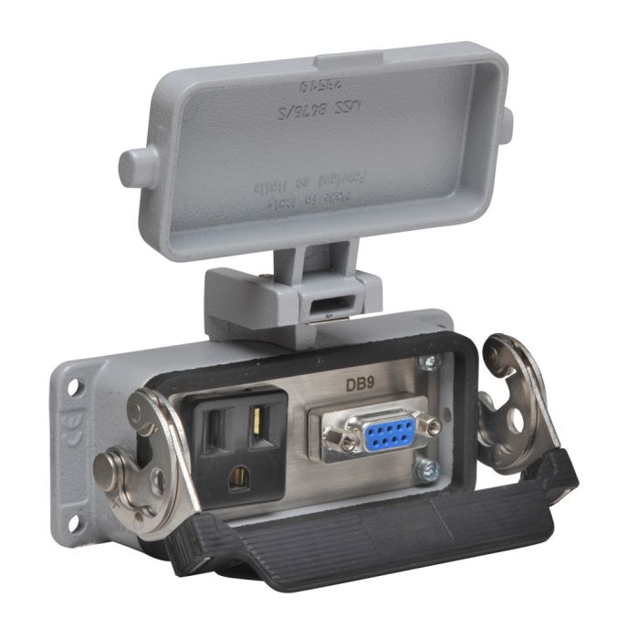 ZIPport panel connector : (1) single 120 VAC outlet, (1) 9-pin D-sub connector with female exterior / male interior.