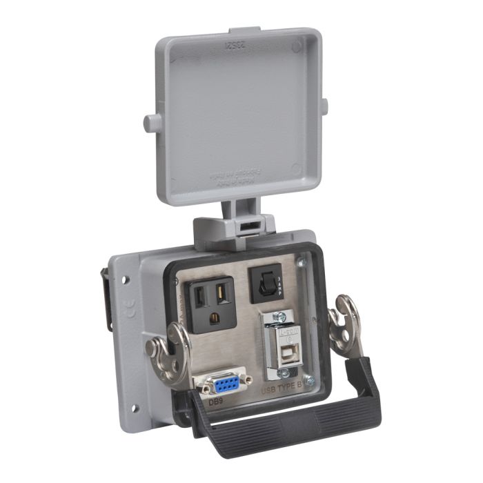 ZIPport panel connector : (1) single 120 VAC outlet, (1) 9-pin D-sub connector with female exterior / male interior, (1) USB, 3A breaker.