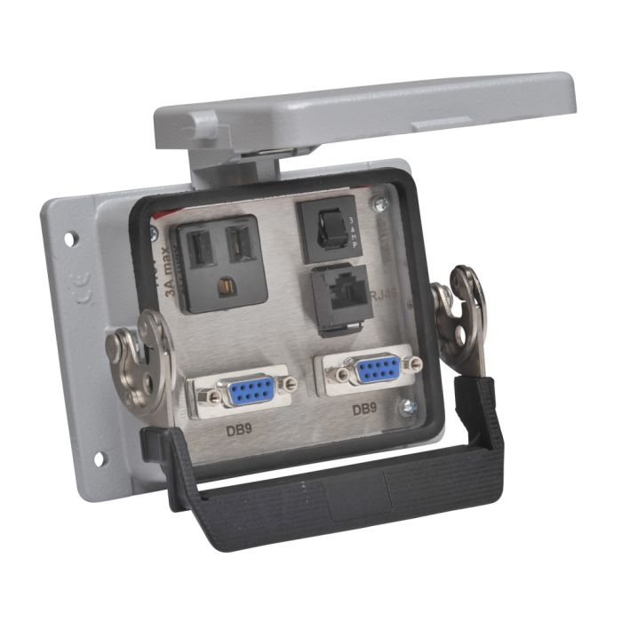 ZIPport panel connector : (1) single 120 VAC outlet, (2) 9-pin D-sub connectors with female exterior / male interior, (1) RJ45 Ethernet connector, 3A breaker.