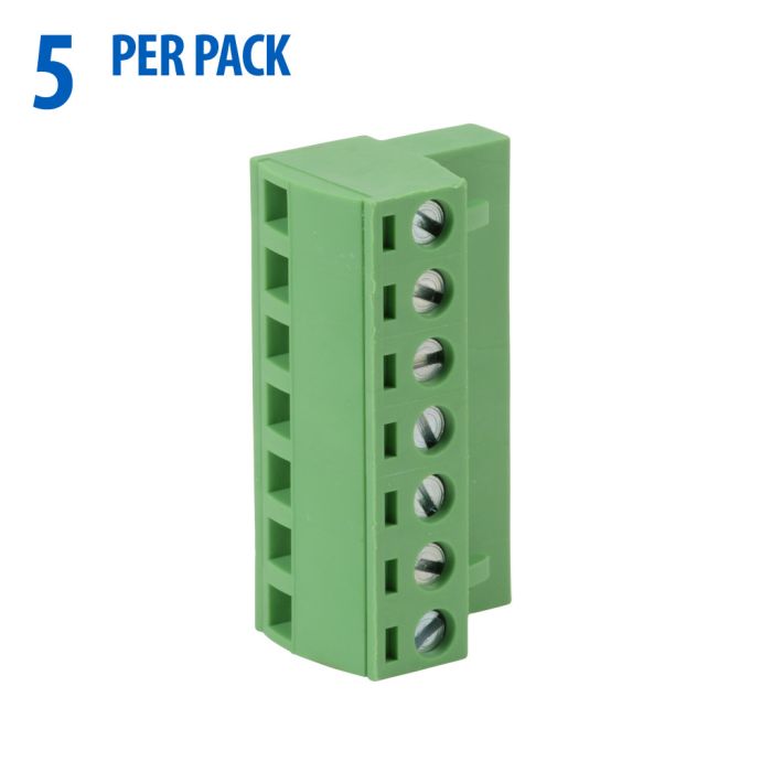 DINnector terminal plug, 7-pole, 22-14 AWG, green, 12A, 300V rated (UL), Top wire entry with terminal screw 90 degrees from entry, 5 pieces per package.