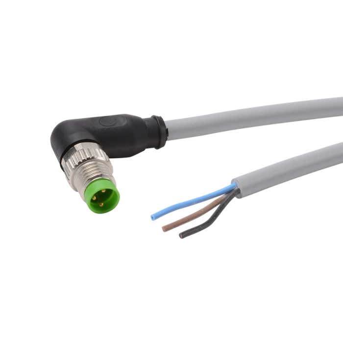Cordset cable, M8 right-angle male to pigtail, 3-pole, PVC jacket, gray, 6.5ft/2m cable length, IP65 IP66K IP67.