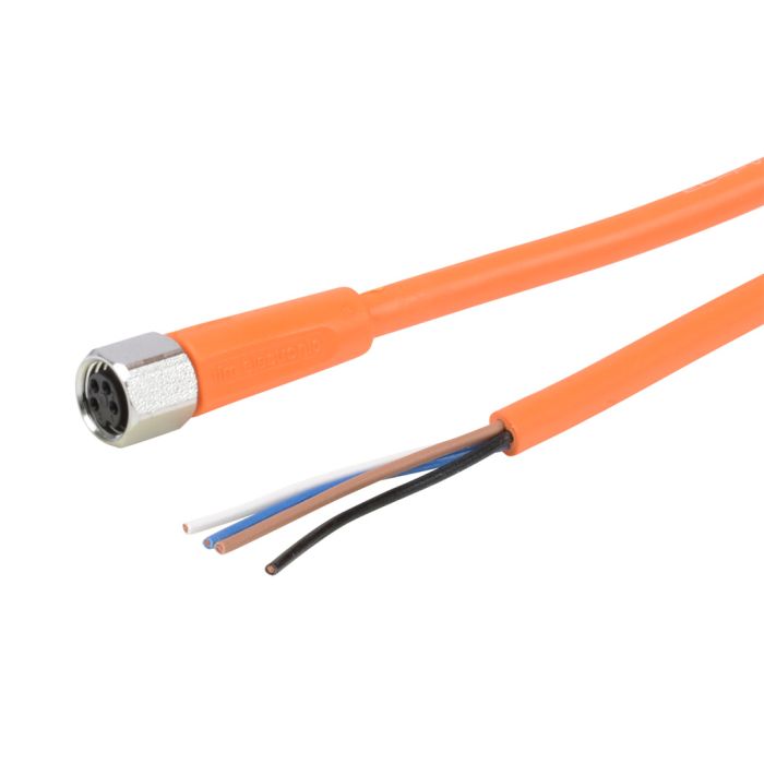 Cable, M8 axial female to pigtail, 4-pole, PVC jacket, orange, 16.4ft/5m cable length, IP65, IP67, IP68 and IP69K, suitable for food and beverage applications.