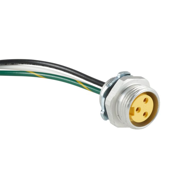 ZIPport bulkhead connector, 7/8in - 16 UN2 thread barrel 3-pin female to pigtail, 16 AWG, 0.9ft/0.3m cable length, PVC conductor insulation material, North American color code. Mounting nut(s) included.