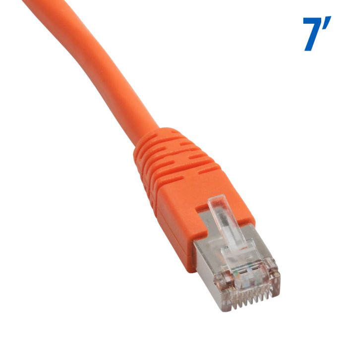 Cat5E straight-through patch cable, STP (overall foil shield), (2) RJ45 male connectors, 7ft cable length, orange. For use with 10/100/1000 Mbps networks.