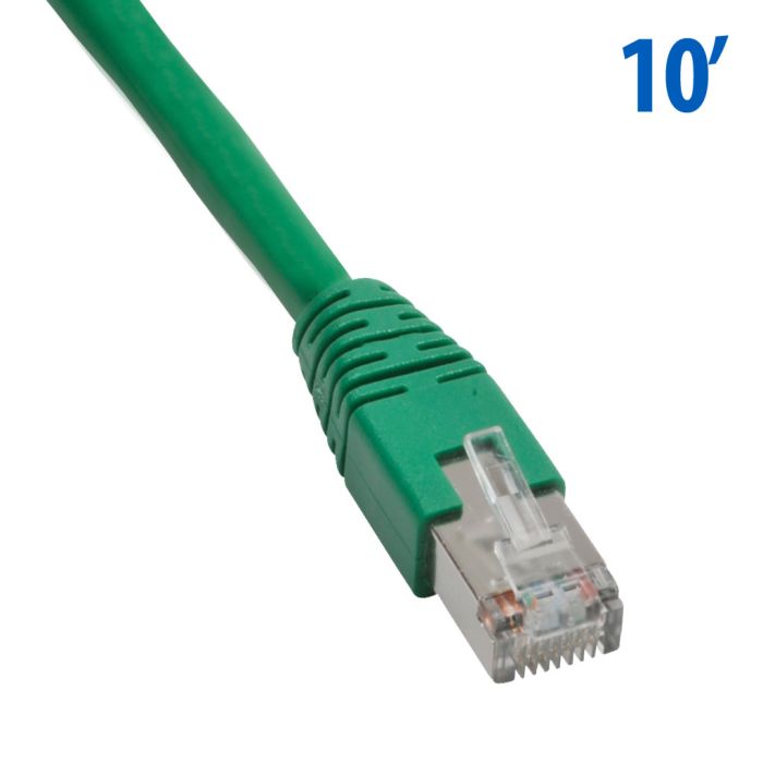 Cat5E straight-through patch cable, STP (overall foil shield), (2) RJ45 male connectors, 10ft cable length, green. For use with 10/100/1000 Mbps networks.