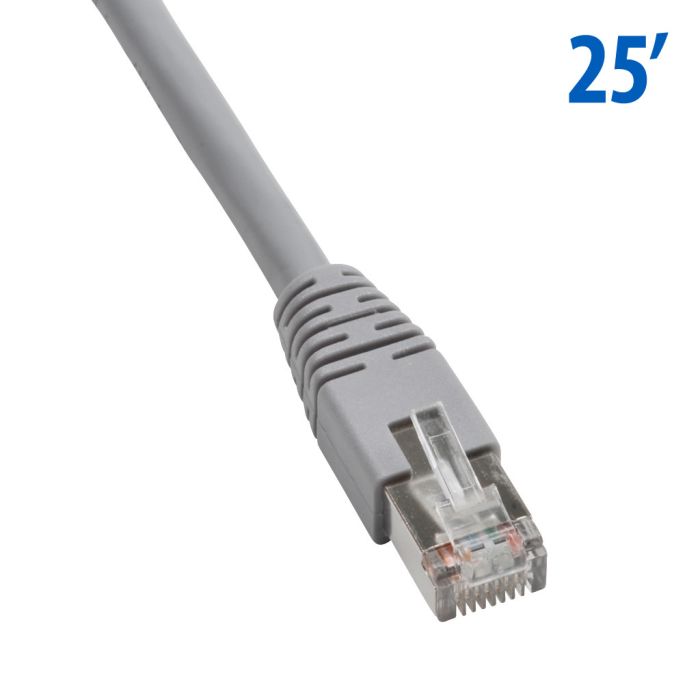 Cat5E straight-through patch cable, STP (overall foil shield), (2) RJ45 male connectors, 25ft cable length, gray. For use with 10/100/1000 Mbps networks.