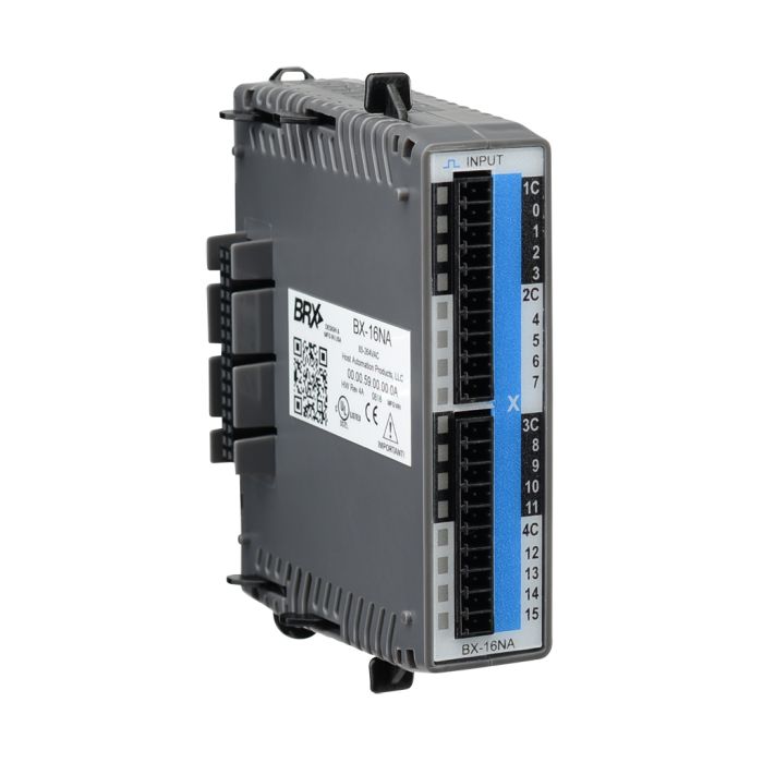 BRX discrete input module, 16-point, 120-240 VAC, 4 isolated common(s), 4 point(s) per common. Requires BX-RTB10, BX-RTB10-1 or BX-RTB10-2 terminal block kit or ZIPLink pre-wired cables.