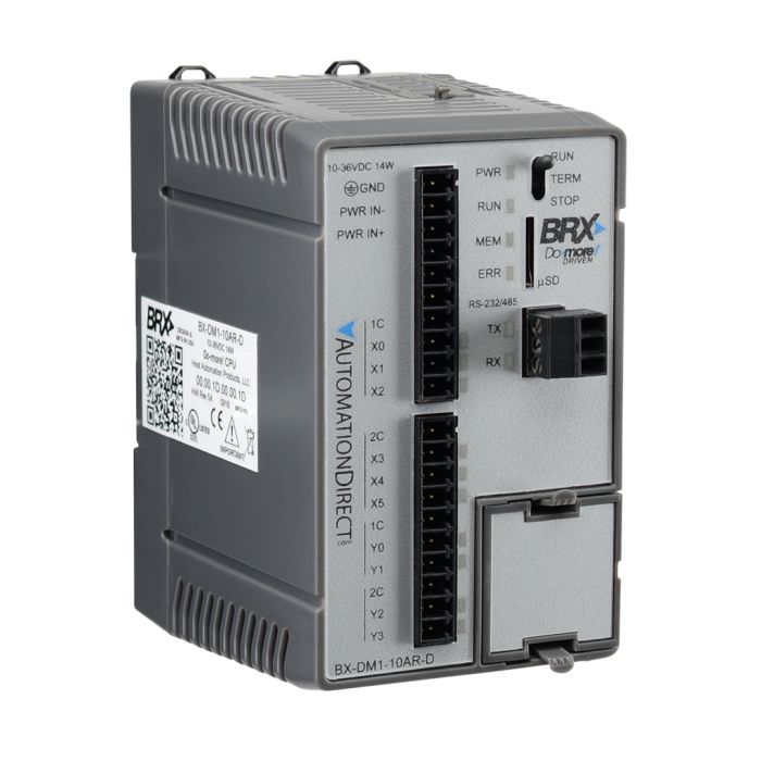 BRX Do-more PLC, 12-24 VDC required, serial port, microSD card slot, Discrete Input: 6-point, AC, Discrete Output: 4-point, relay.