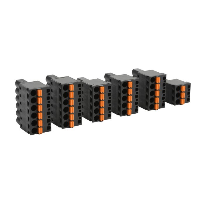 BRX terminal block kit, 180-degree spring clamp. For use with BRX 18-point PLCs. Includes (3) 5-pin 5mm terminal blocks, (2) 6-pin 5mm terminal blocks and (1) 3-pin 5mm terminal blocks.