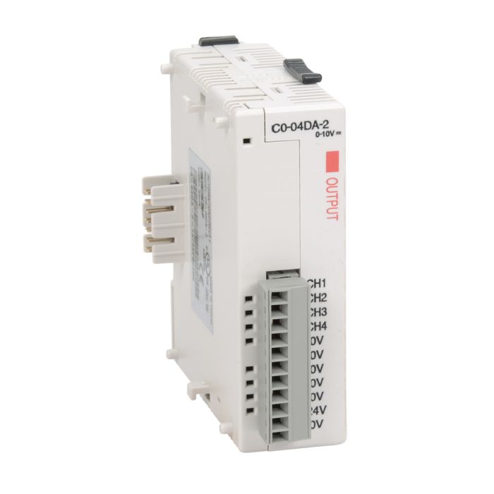 CLICK analog output module, 4-channel, voltage, 12-bit, output voltage signal range(s) of 0-10 VDC, external 24 VDC required.