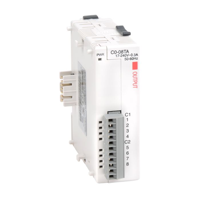 CLICK discrete output module, 8-point, 17-240 VAC, 2 isolated common(s), 4 point(s) per common, 0.3A/point. Removable terminal block included.