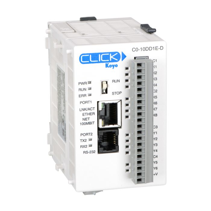 CLICK Ethernet Basic PLC, 24 VDC required, Ethernet and serial ports, Discrete Input: 8-point, DC, Discrete Output: 6-point, sinking.