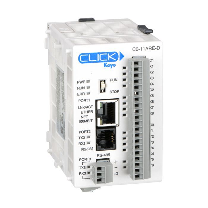 CLICK Ethernet Standard PLC, 8 KB user memory, real time clock/calendar, retentive memory, Ethernet (RJ45) port with Modbus TCP, programming and monitoring protocol(s) at 10/100 Mbps, RS-232 (RJ12) port with Modbus RTU Master/Slave and ASCII In/out protocol(s) at up to 115.2k baud, RS-485 (3-wire terminal block) port with Modbus RTU Master/Slave and ASCII In/out protocol(s) at up to 115.2k baud, 8-point input, 120 VAC, 6-point output, Form A (SPST) relay(s), 6 - 240 VAC / 6 - 27 VDC. Removable terminal block included. Requires CLICK programming software v2.00 or later and CLICK CPU firmware v2.00 or later.